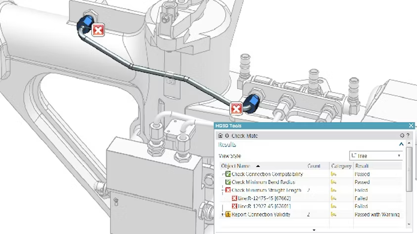 访问设计规则检查以确保您的管线系统设计遵循标准设计实践。可扩展规则集包括对最小弯曲半径、最小长度、连接兼容性、流向和其他特性的检查。规则检查可以同时运行或按需运行,NX 检测到规则冲突时会立即发出警告。规则驱动的路径规划和布线功能可提高质量并消除错误。