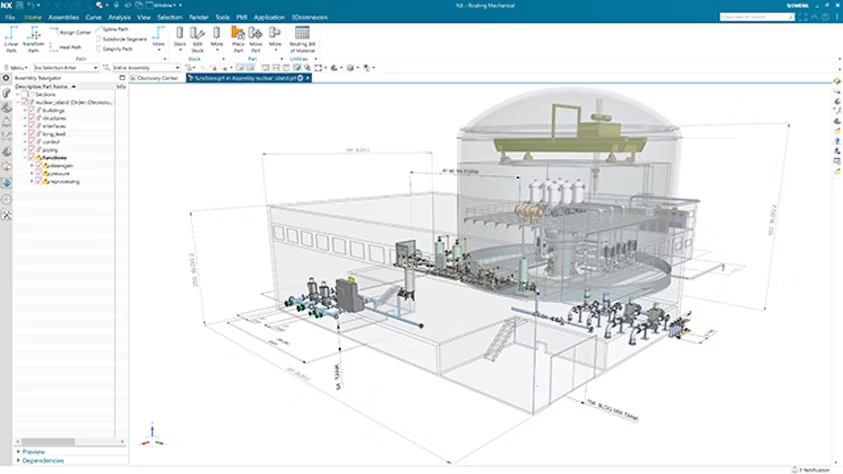 借助 NX 的流体和机械系统管线布置功能,准备制造所需的所有文档。该软件可自动执行计算切割长度、对零部件和型材编号、创建物料清单和折弯报告以及生成制造图纸的过程。